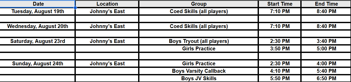 Please refer to the schedule below for how the clinics and tryouts will be organized: